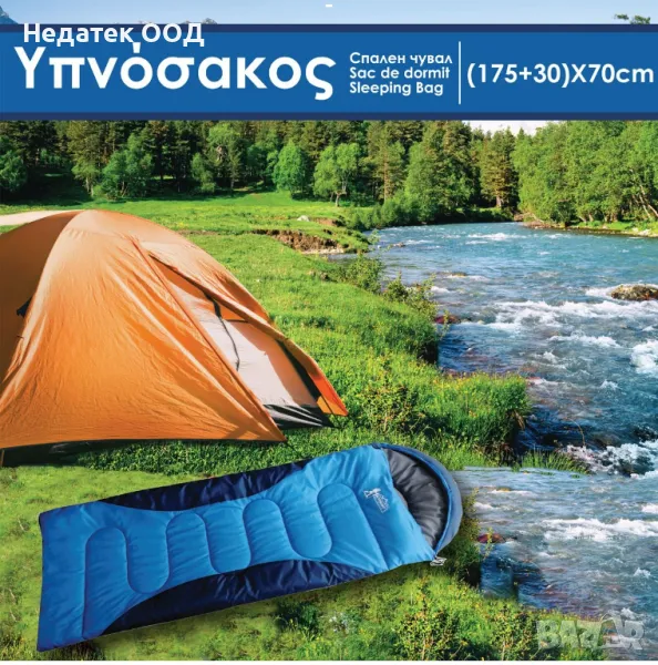 Спален чувал в цвят син сиел. Облицована е с полипропилен и пълнеж от полиестерни влакна. Намира се в практична чанта с дръжка. Има цип от едната страна и въженце, което събира горната част като качулка.