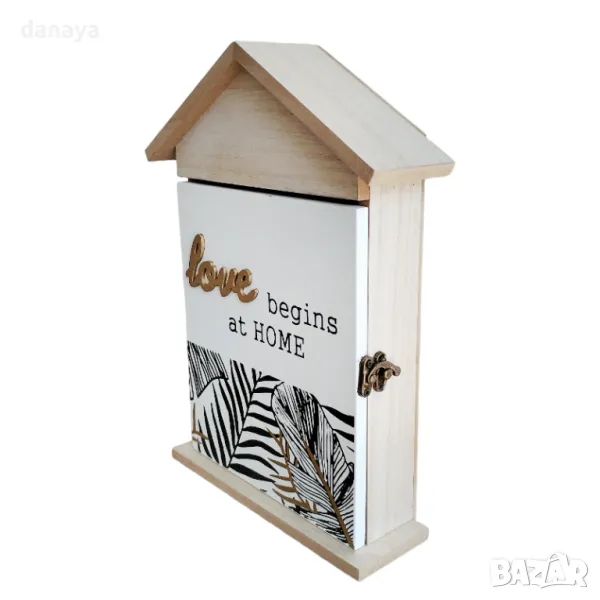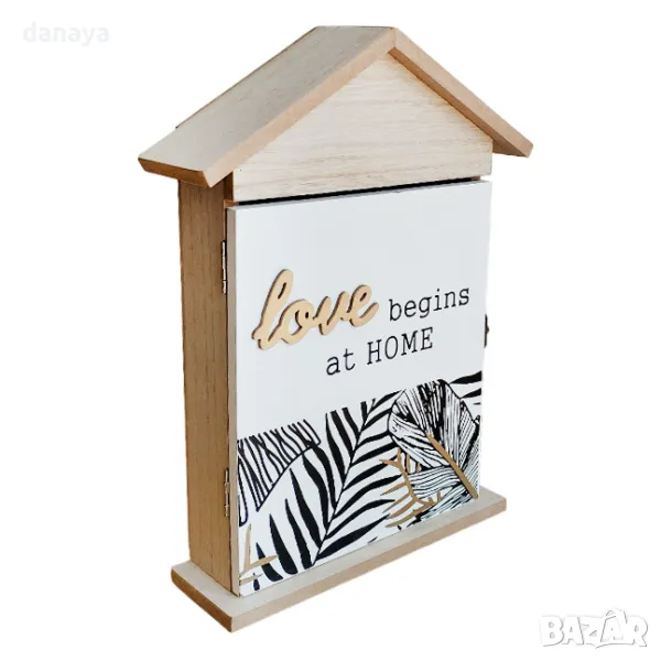 Красива и стилна кутия за ключове с надпис Love begins at Home, красиво декорирана с принт на листа и пера. В кутията има 5 кукички за закачане на ключове и дребни аксесоари.