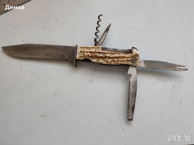 Мултифункционален немски нож от 1950-те години, ковано острие от жилава стомана, пружините са здрави, стегнати - инструментите се прибират стабилно към дръжката, кания от естествена кожа.
