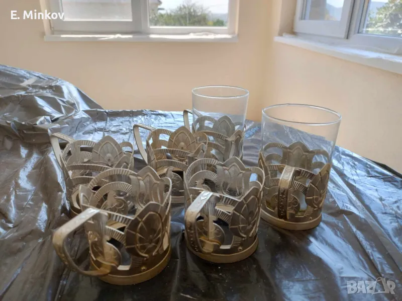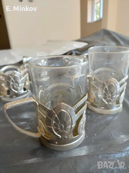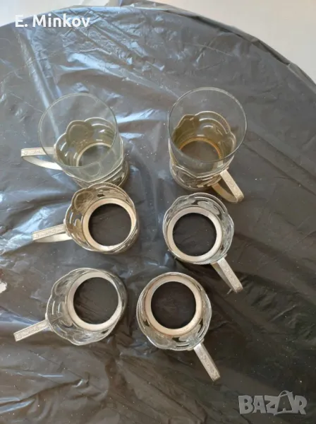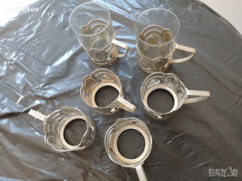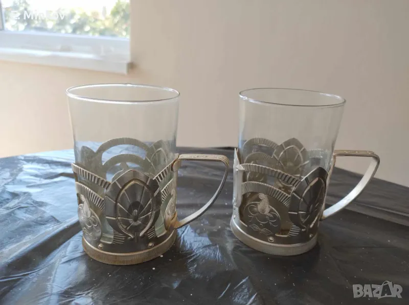 Комлект 2 стъклени чаши за чай с метални подложки - 20 лв.