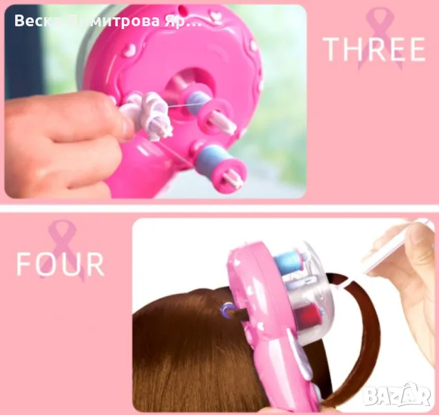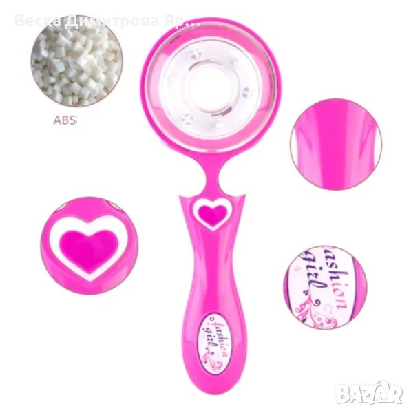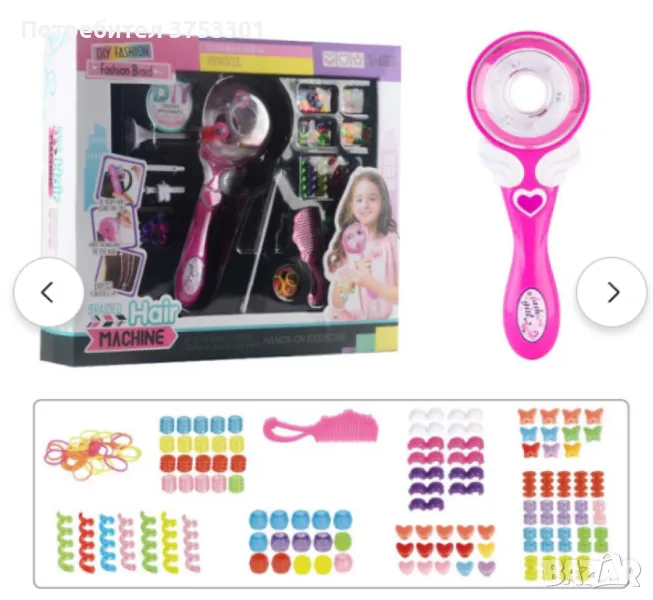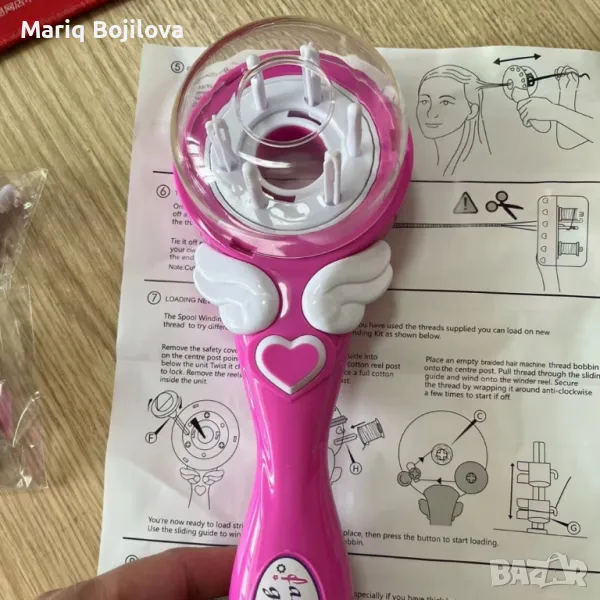 Детски уред за вплитане на плитки и декорации в косата / Размер - 24 см Х 9.1 см Х 2.6 см; Цвят - розов; Тегло на комплекта - 1 кг; Материал - подсилена ABS пластмаса; Специален safety дизайн със защита за детската коса; Възможност за едновременна употреба на три цветни връвчици за вплитане; Прозрачен пластмасов щит за добра видимост и допълнителна защита; Дръжка с удобен и здрав захват; Копче във формата на сърце за включване и изключване; Захранване - 2 бр Х АА батерии (не са включени); Забавни и разноцветни пластмасови декорации за коса - пинчета/стопери, спиралки, силиконови ластичета, декоративни фигурки; Бонус - малък кокетен гребен в комплекта;
