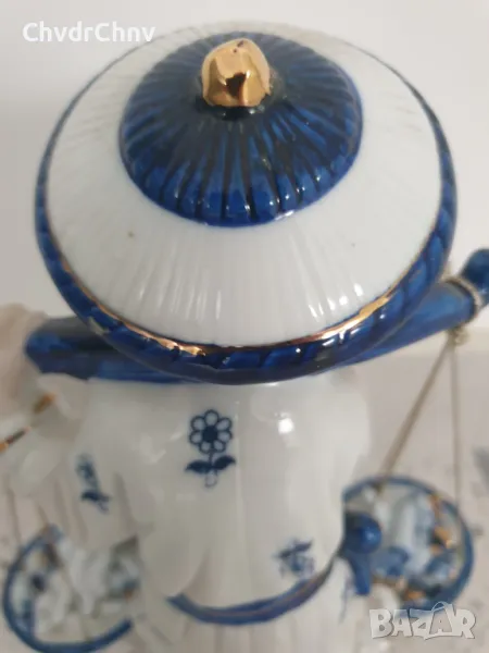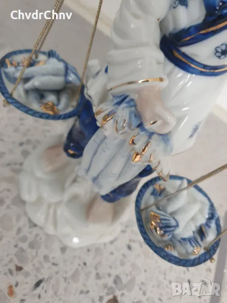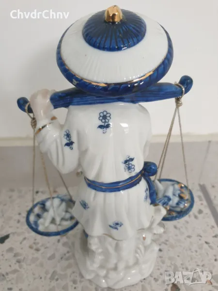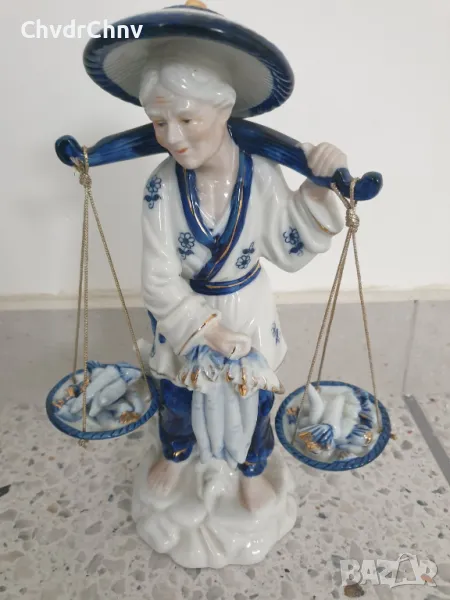 40 (статуетка 2) жена в синьо-бяла традиционна японска носия, носи/продава калмари. Височина 26 см. Виждал съм доста подобни но с липси (везните) или протриване на позлатата.