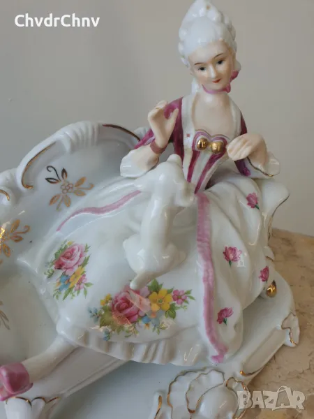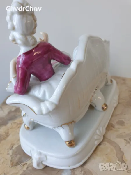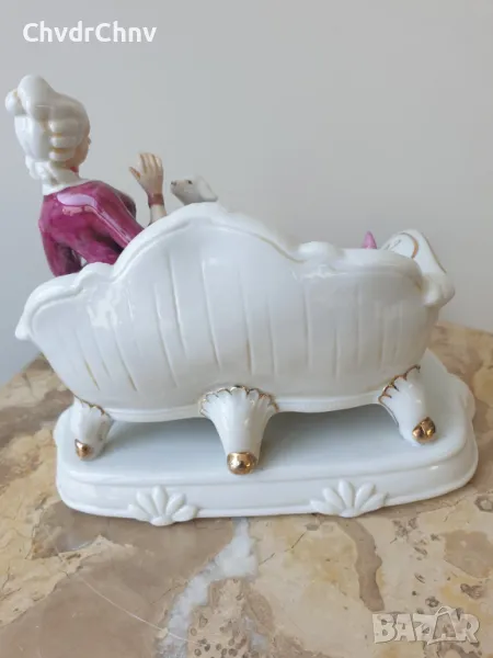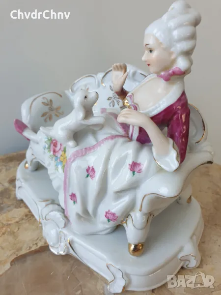 50 (статуетка 1) дама седнала на диван и играеща си с кученце. Височина 16 см, дължина 20 см, ширина 12 см.