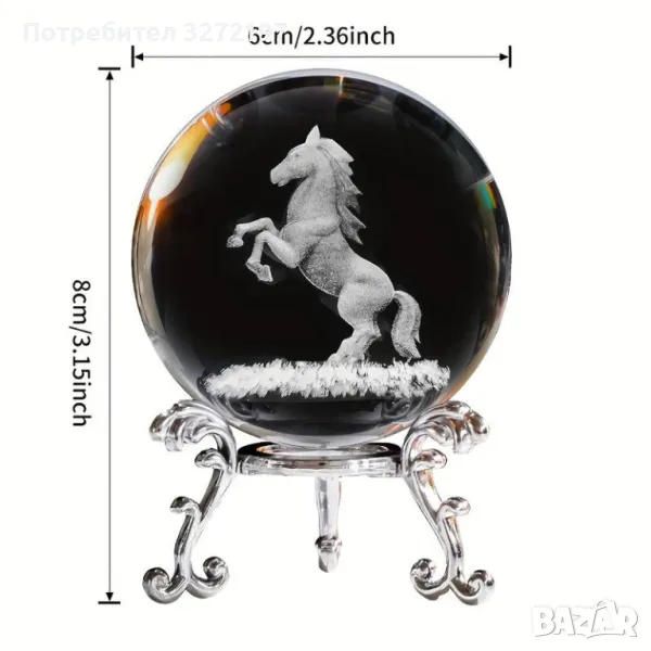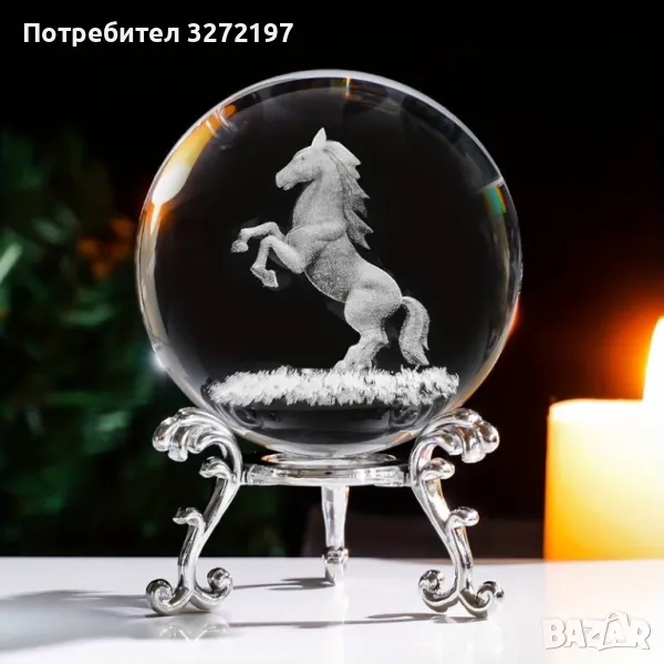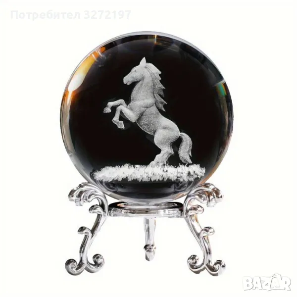 3D Прозрачен орнамент Кон в кристална топка 60 мм + стойка орнамент