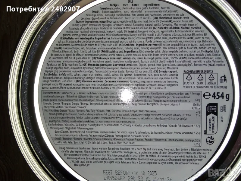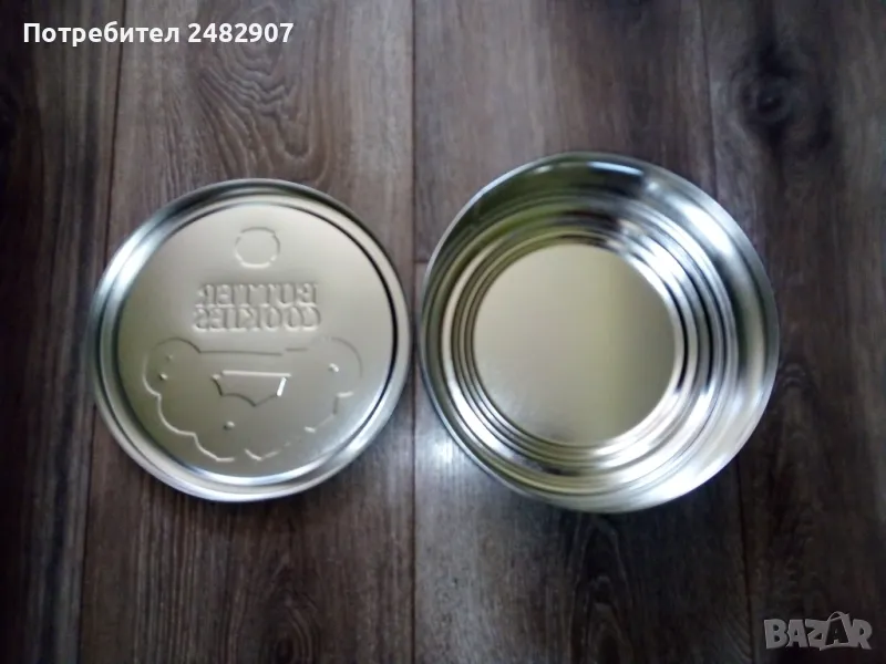 Метална кутия с капак за съхранение на бисквити, сладки и други дреболии. Височина - 6,5 см, диаметър - 19 см.