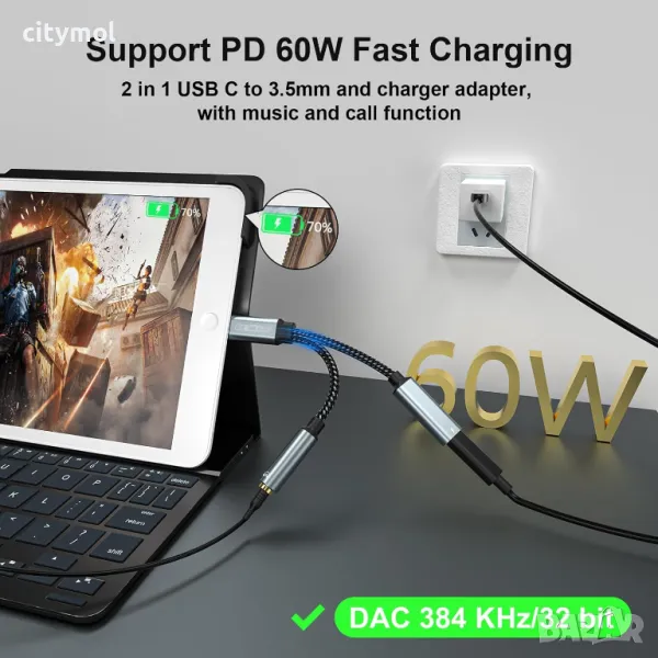 - Адаптерът тип c до 3,5 mm aux поддържа протокол за бързо зареждане до PD 60W, безопасно и стабилно бързо зареждане без прегряване и вграден надграден декодиращ чип за осигуряване на стабилно напрежение и ток и защитава вашето устройство за по-дълъг период от време. Съвети: Препоръчваме да използвате PD стенно зарядно за по-бързо зареждане.
