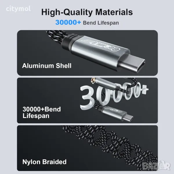 TYPE C към TYPE C и 3,5 мм, адаптер за слушалки и зареждане, найлонова оплетка, 60 W