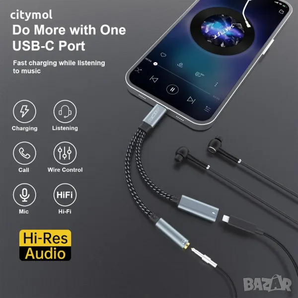 - Този 2 в 1 usb c адаптер за слушалки и зарядно устройство ви позволява бързо да зареждате устройствата си, докато слушате музика, играете игри, се обаждате или гледате видеоклипове (до 60 W изход) , няма нужда да се притеснявате, че батерията ще се изтощи, поддържа вградено управление. Здравата обвивка от алуминиева сплав и плетената втулка гарантират, че адаптерът може да издържи повече от 30 000 пъти живот на огъване.