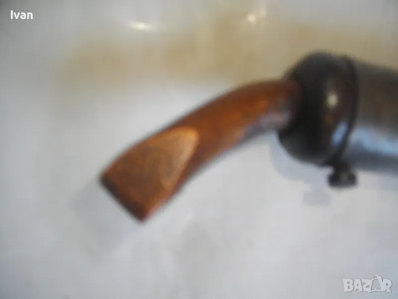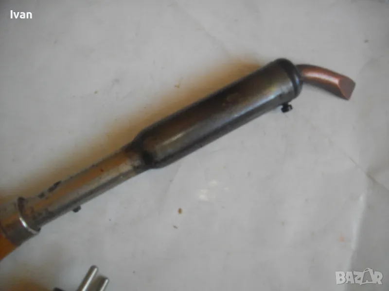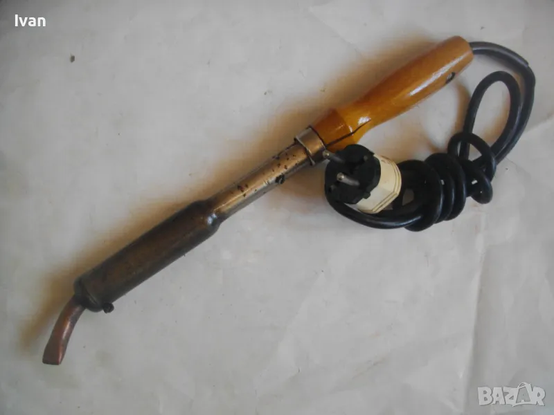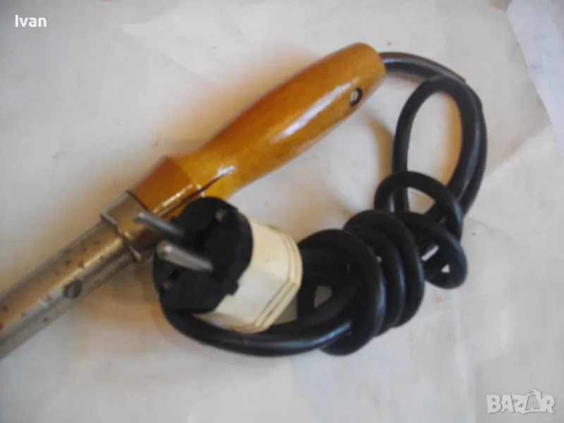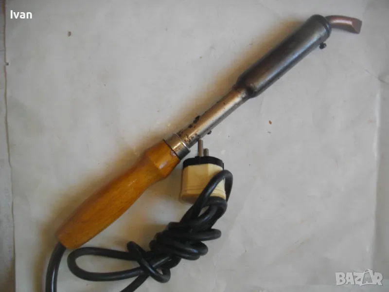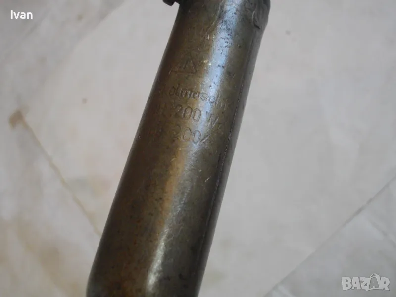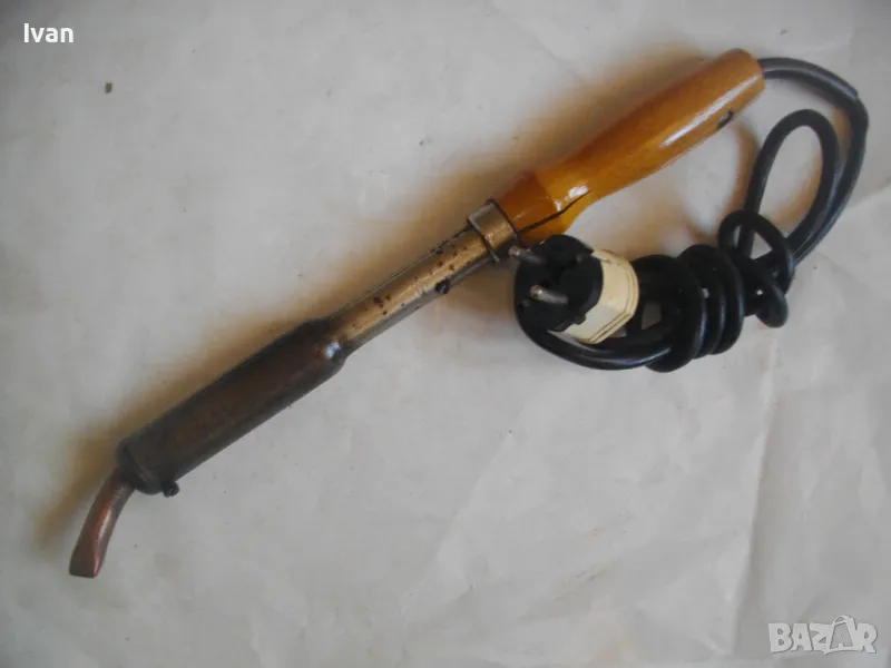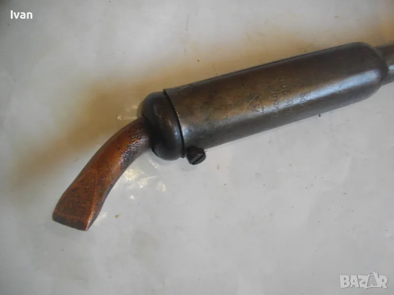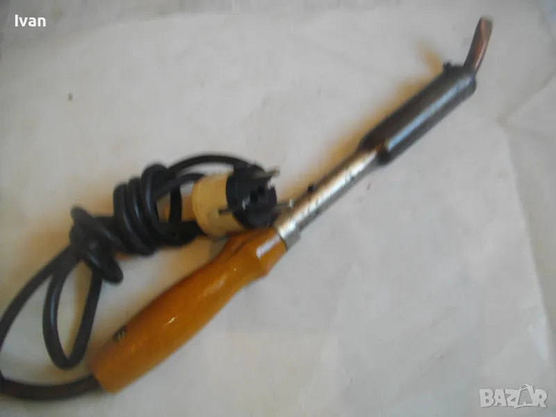 ОПИСАНИЕ на ел.поляник 200 вата. Старо немско качество Зап.Германия. Марка и модел - VEB Type 2004. Производство -западна Германия/ W. Germany Захранване -220 волта ,мощност 200 вата. Реотанов, масивен. Почти нов, много запазен външен вид, отлично техническо/работно състояние. Дължина - 350 мм, човка - масивна медна, дължина 50 мм, ширина 12 мм. Дървена дръжка, оригинален трижилен гумиран кабел, оригинален VEB западногермански бакелит щепсел. Цена на поялника - 199 лв.