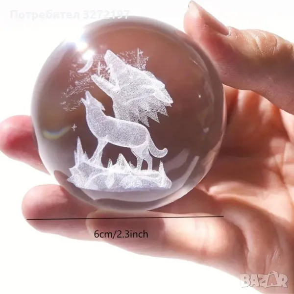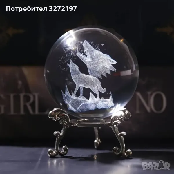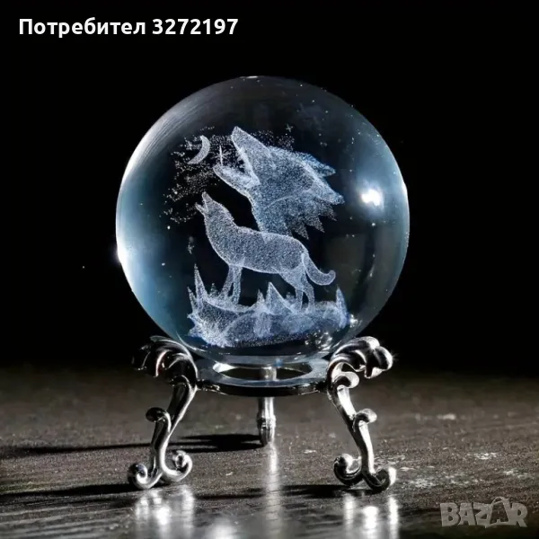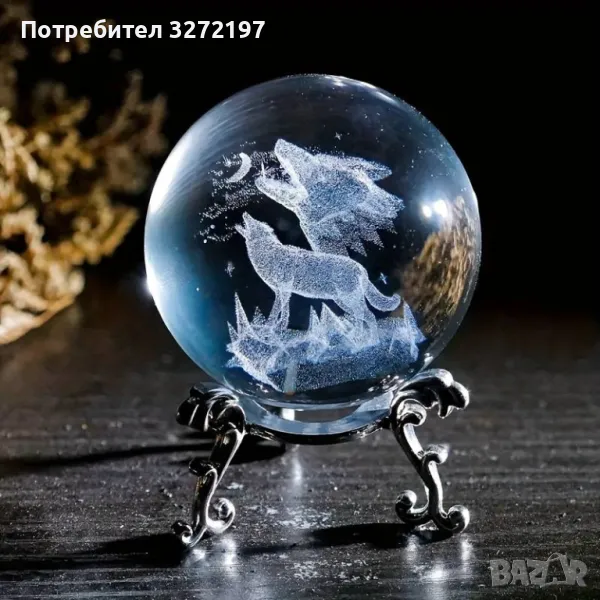 3D Прозрачен орнамент с Вълк единак в кристална топка 60 мм + стойка орнамент
