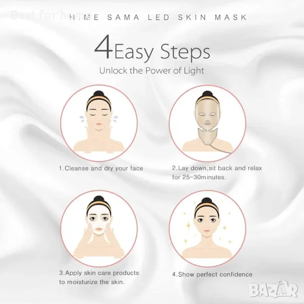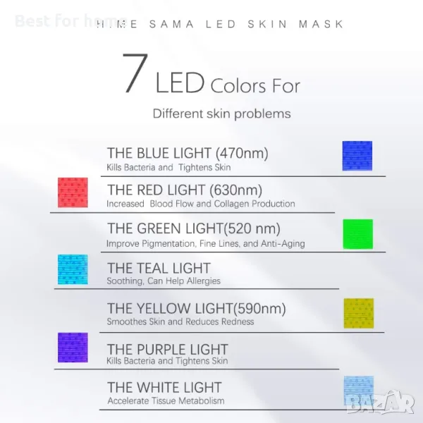 ✿Pro 7 цвята с различна употреба: Маската има 192 LED светлини с 5 нива на светлина от 7 цвята по избор: ♩Червена светлина- Повишен кръвоток и производство на колаген♩Синя светлина- Успокоява и стяга кожата♩Зелена светлина- Подобрява пигментацията, изглажда Линии и против стареене | Жълта светлина- изглажда кожата и намалява зачервяването♩Лилава светлина- релаксира, подобрява кожата | Светлосиня светлина - успокояваща♩НОВА бяла светлина - ускоряване на тъканния метаболизъм