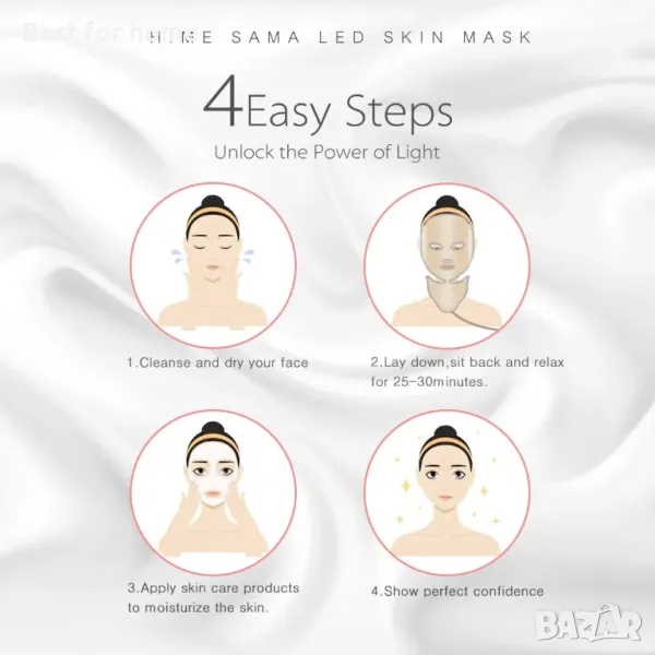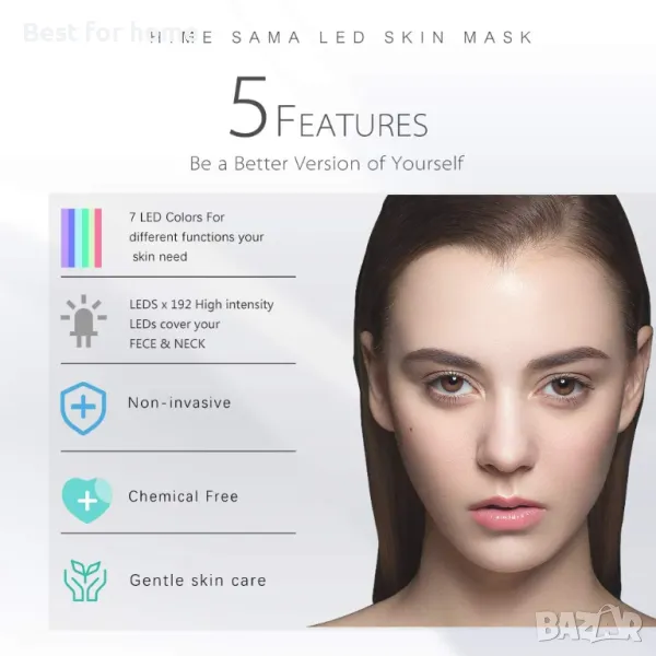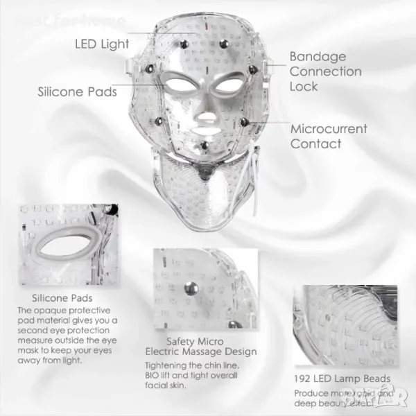 Светодиодната светлинна маска за лице ще ви помогне бързо и естествено с много дефекти като фини линии, бръчки, големи пори, сухота, омазняване и други! LED маската за лице е светлинна маска против стареене РЕВОЛЮЦИОННА система ВСИЧКО В ЕДНО против стареене, която синергично помага за трансформиране и подмладяване на кожата ви за по-младежки вид. Нашата маска използва естествени светлинни вълни, за да подмлади кожата ви!