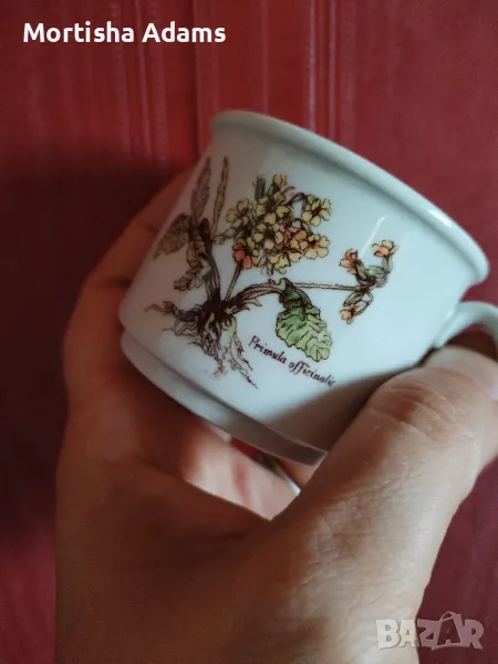 Нежен сервиз за кафе, фина керамика, серия "Ботаника"- "Primula Officinalis" или "Лечебна иглика". Без маркировка. Липсва една чинийка.