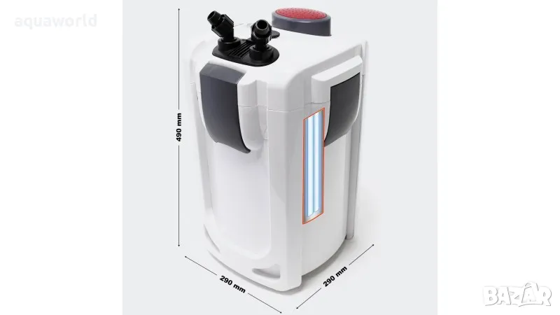 Този филтър е подходящ, както за морски, така и за сладководни аквариуми. Той е мощен, ефективен и същевременно тих. Лесен е за инсталиране и поддръжка, има три кошници за различни основи – за механични, биологични и химически вещества. Филтърът притежава керамични валове за по-дълъг експлоатационен живот на ротора. Вградената UV-лампа (9W) предотвратява появата на зелени водорасли, патогенни бактерии и микроорганизми. Лампата се включва и изключва. Към него са включени всички аксесоари - тръби, маркучи, адаптери, дюзи и пълнител за механична филтрация.