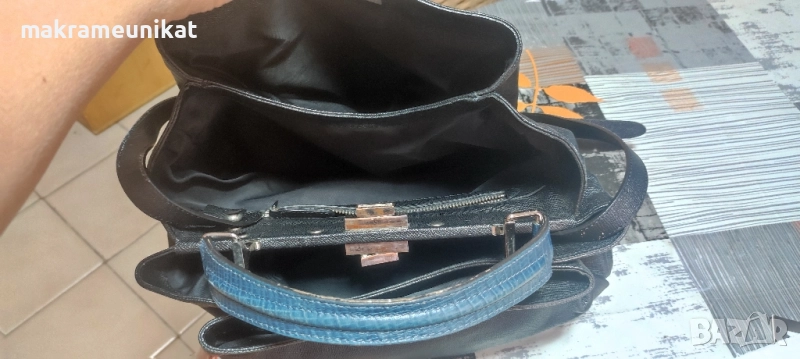 Продавам дамска чанта, голяма, кожа, цвят графит. Точните размери са в снимките. Голяма, с много джобове , подходяща за всекидневието, за университета, за училище, защото побира голям формат тетрадки, лаптоп,и много други принадлежности.