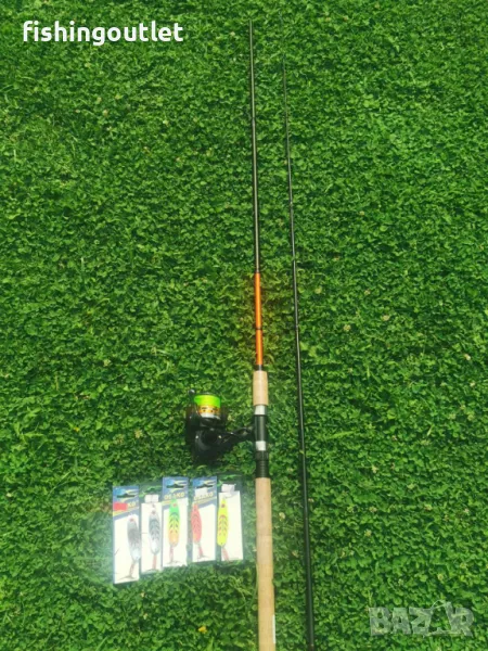 Спининг комплект за щука и бяла риба-въдица,макара,плетено влакно и 5 блесни