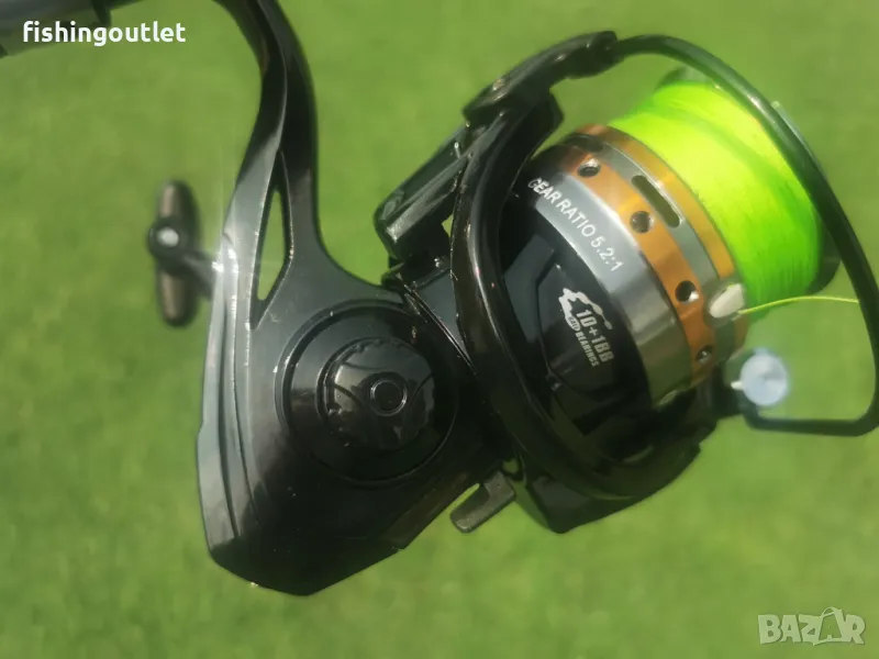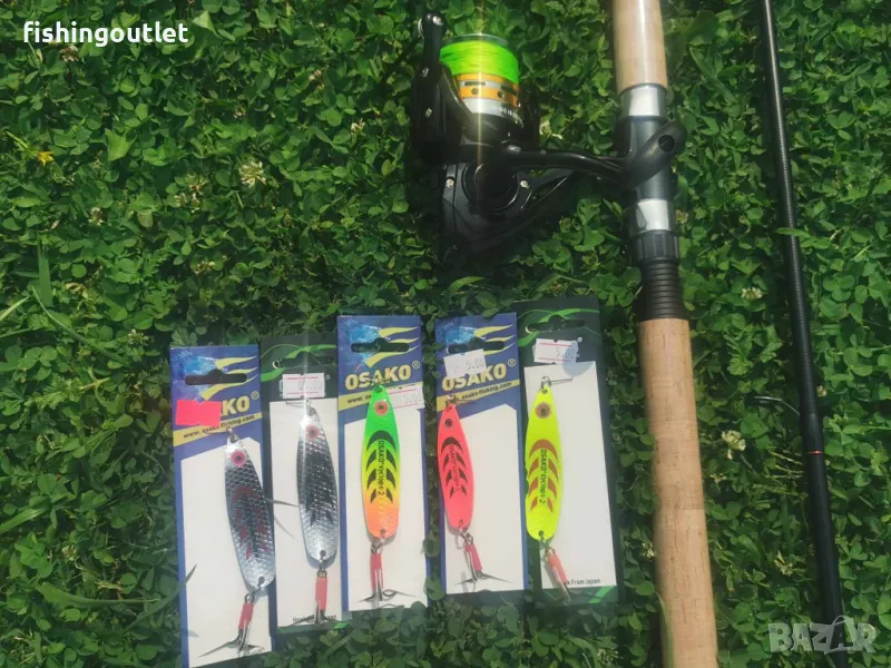 Към въдицата и макарата получавате и плетено влакно Osako 100mt 4 нишково с тест/тегло 9кг ( във водата над 15кг ) и 5 клатушки Циклоп с разлини цветове.