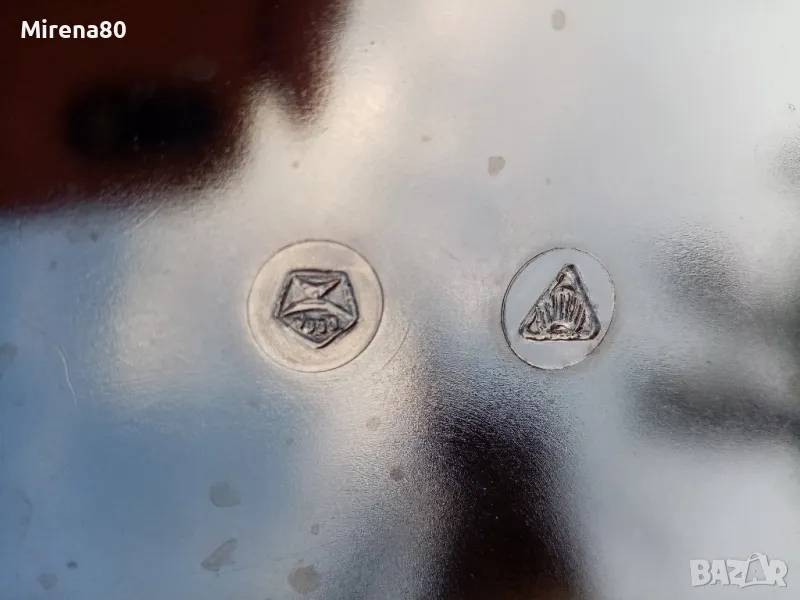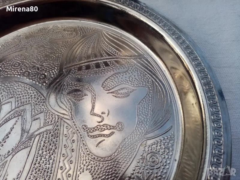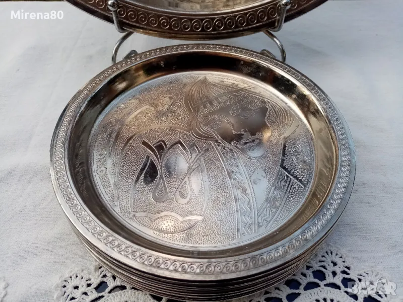 Много красив метален сервиз , състоящ се от голям поднос (35 см) + 6 десертни чинийки (17 см). Производство - СССР, 80-те години, маркировката също е с надпис СССР. Неизползван, с