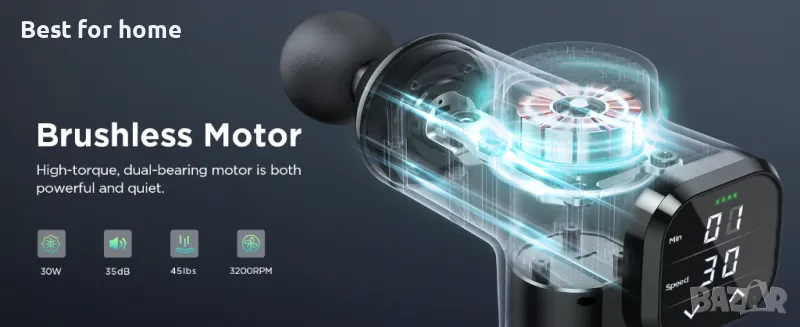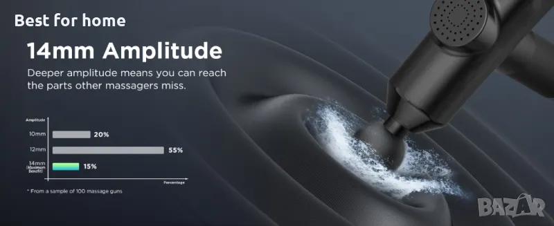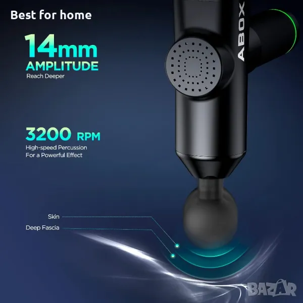 Мощен масажен пистолет Deep Tissue: Масажор с безчетков мотор с висок въртящ момент, който се развива до 3200 RPM, помага за достигане на мускули до 14 mm дълбочина в рамките на 3-4 секунди, подмладява възпалената тъкан и болките в мускулите, като изпраща вълни от вибрация до 14 mm дълбочина в рамките на 3-4 секунди до гърба, краката, ръцете, раменете, гърба, врата, прасците и др.