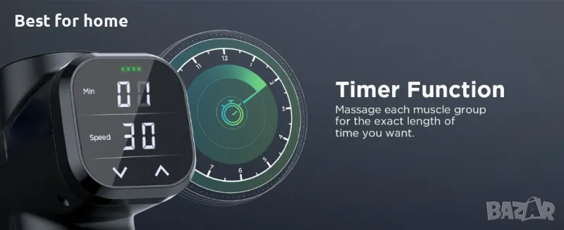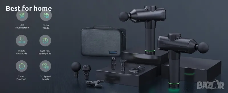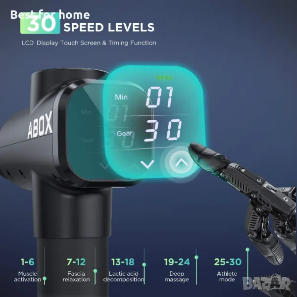 30 регулируеми скорости + 6 масажни глави: Професионален ръчен масажен пистолет с 6 30 нива на скорост и 6 сменяеми масажни глави, насочени към различни части на тялото и мускулни групи. Чувствителният LCD сензорен екран е по-лесен за използване и може ясно да показва информация като продължителност на масажа, скорост и текуща ефективност. Подарък, който си струва да подарите на вашите семейства!