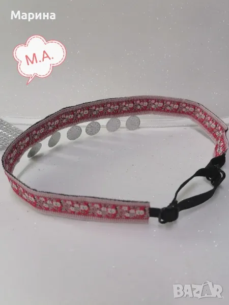 Ширина на косичник 2см., пендари златисти d-15мм., дължина на лента 38см., ластикът се регулира.