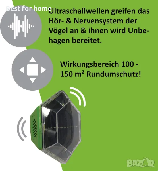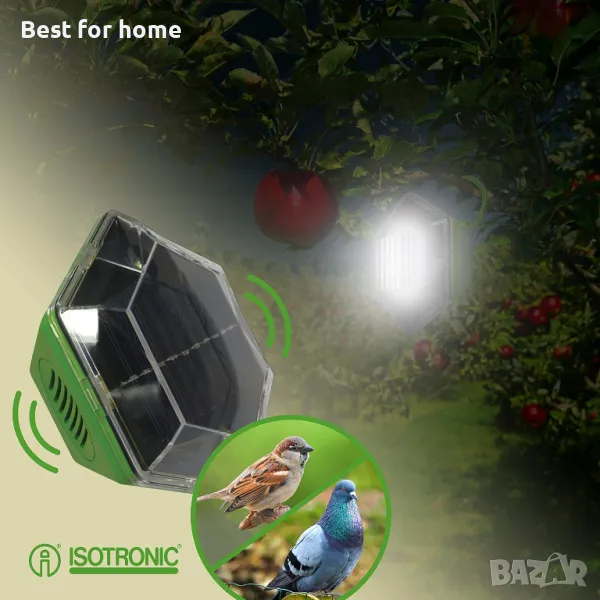 Описание на продукта Иновативната Bird-Repeller защита срещу повечето птици, чайки и гълъби от ISOTRONIC. Работи със слънчева енергия, мобилен и високоефективен. Няма да се налага да се разстройвате от нежелани посещения на животни във вашите помещения. ISOTRONIC Bird-Repeller-Protector Mobile държи злите вредители далеч от вашата кола, къща, градина, гараж, плевня, таван или беседка. Незабавно готов за употреба, не е необходимо захранване и сглобяване. Интегрираното 30-секундно превключване на интервали не позволява на животните да свикнат със звука. Без необходимост от досадно окабеляване, това ново устройство от ISOTRONIC вече може да се използва незабавно на всички възможни места. място. Включете.