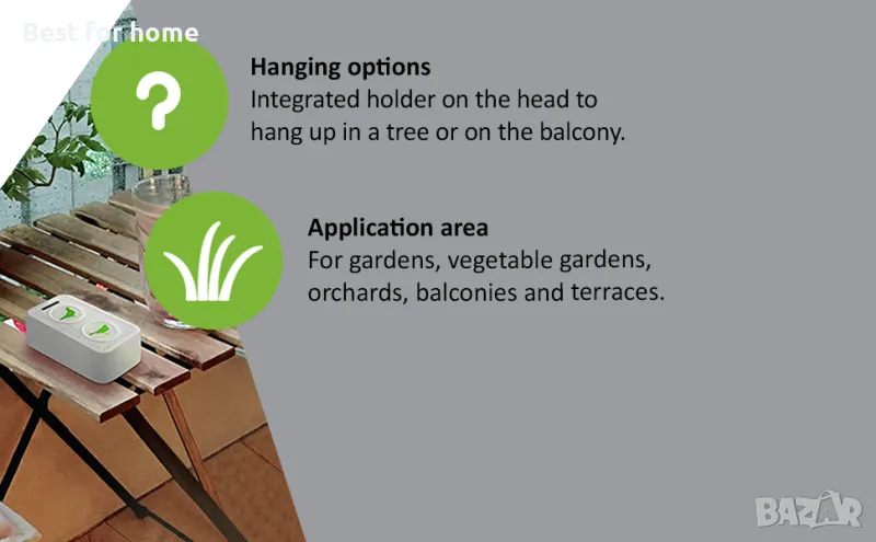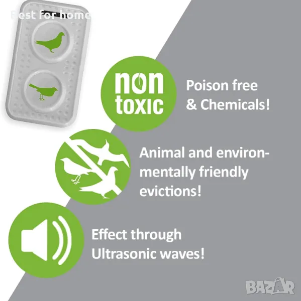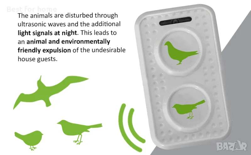 Компактен прогонвач на гълъби/птици: ултразвуковият прогонител може да се използва навсякъде. Един комплект батерии (6 x AAA батерии, не са включени) има живот до три месеца.
