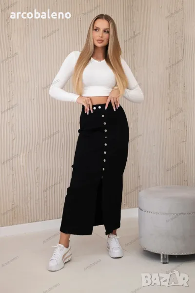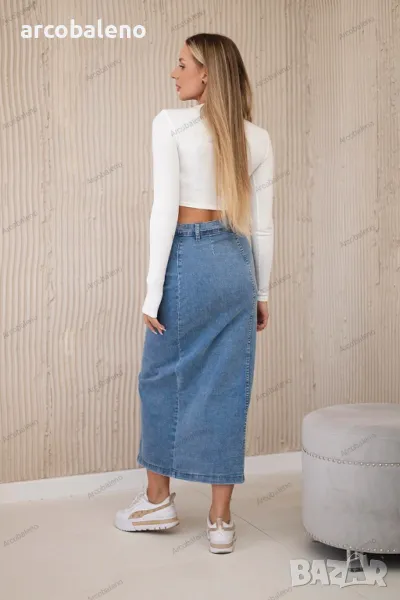 Дънковата дълга пола с копчета е класически и универсален елемент от гардероба, който съчетава елегантност с небрежен стил. Изработен от висококачествен деним, осигурява издръжливост и комфорт. Дългата кройка придава елегантен характер, а копчетата отпред са модерен акцент, който прави полата лесна за обличане и събуване. Перфектна за различни поводи, от ежедневието до по-официалните събития, тази пола се съчетава перфектно с топове, ризи и пуловери, създавайки елегантни и удобни тоалети.