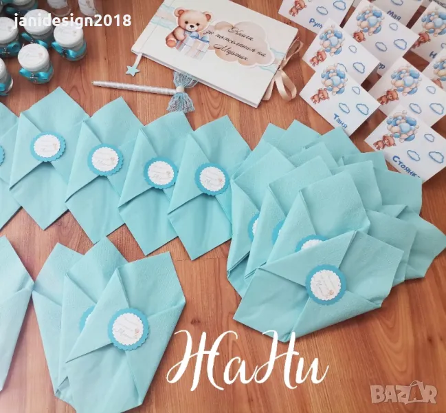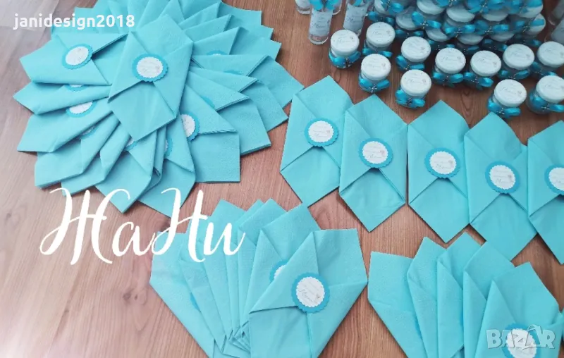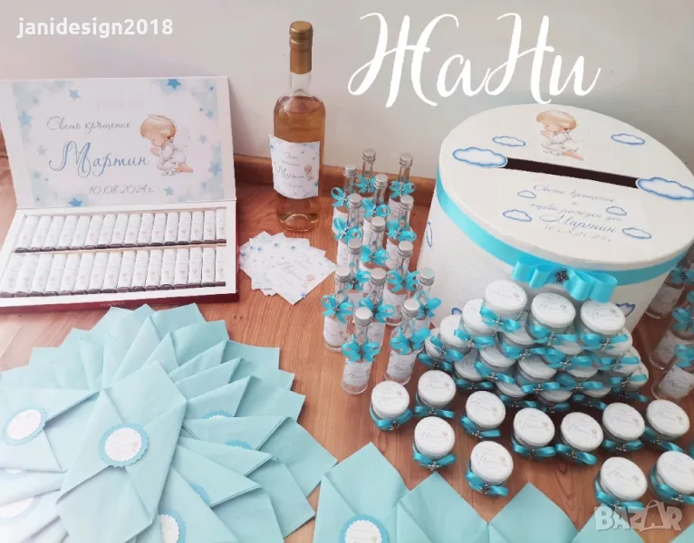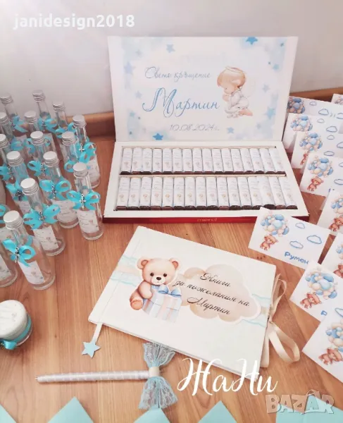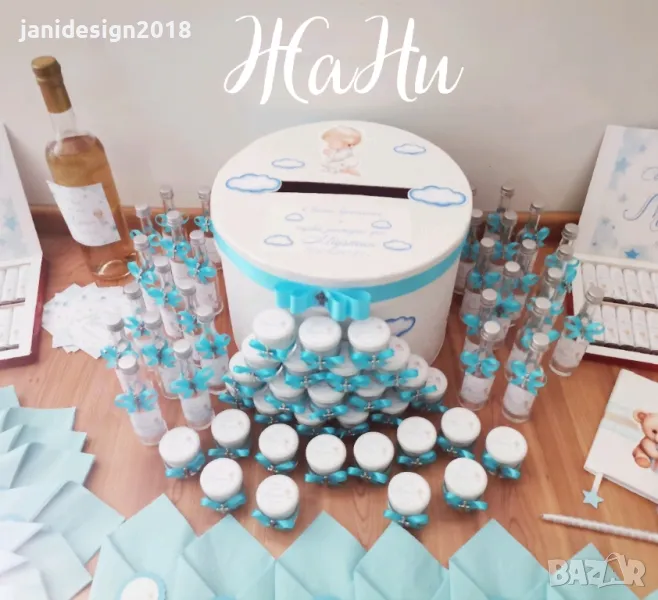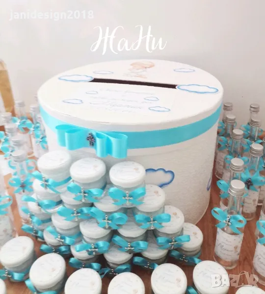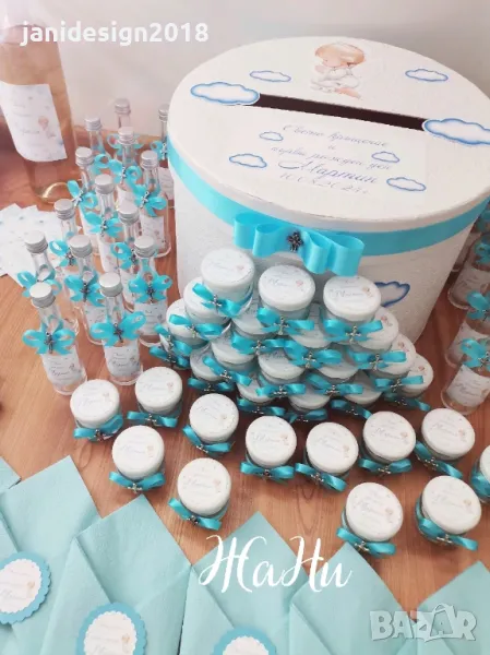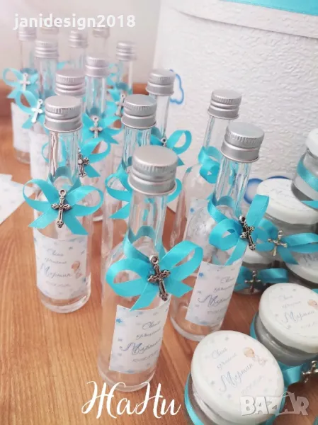 * подаръчета за гостите бурканче свещ и бутилки за светена вода