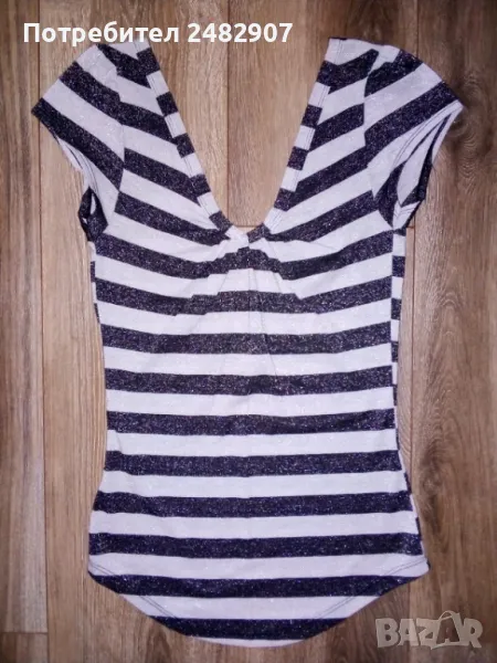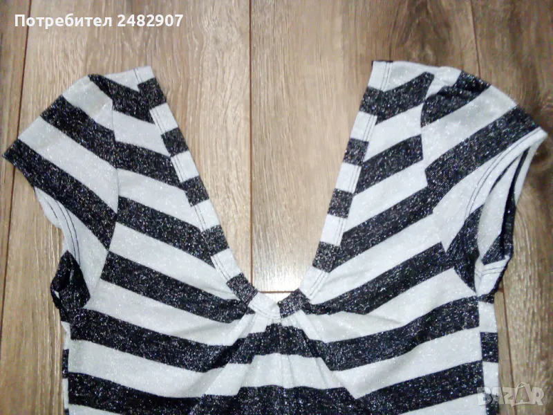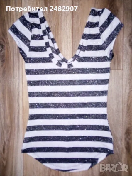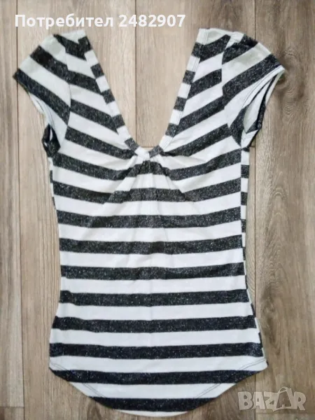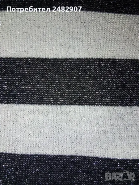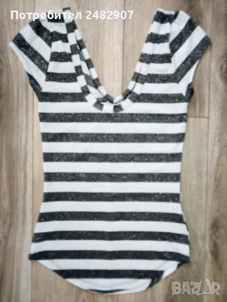 Дамска блуза с къс ръкав и блестящ ефект на черни и сиви раета, размер - XS. Ширина в раменете - 29 см, ширина под мишниците - 35 см, ширина в долната част - 37 см, дължина от рамото до долу - 63 см, дължина на ръкава от рамото - 9,5 см, ширина на ръкава в долната част - 14 см. Много запазена, почти не е използвана, отлично състояние, без забележки.