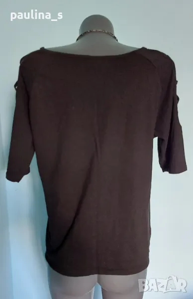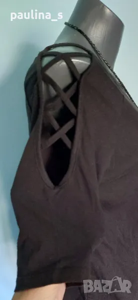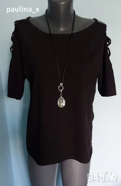 Актуална черна блуза или топ с открити рамене и прекръстосани шнурове. Ръкавите са 7 / 8 и реглан. Материята е памук и ликра, приятна за допир и доста еластична и покрива няколко размера, посочени са. Една бройка е, без дефекти и етикет, голям размер.