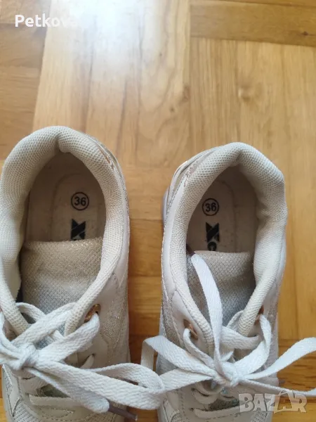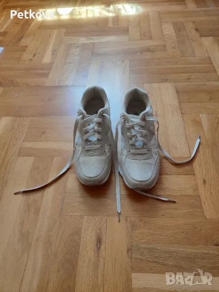 Бежови със златисто сникъри! Като нови са, обувани броени пъти, нямат следи от носено, надраскано, олющено, то се вижда на снимките! Просто са ми големи, дори и с допълнителна стелка! Дължина на стелка 23,5см, височина на тока отзад 5см, отпред 2см. Много удобни.
