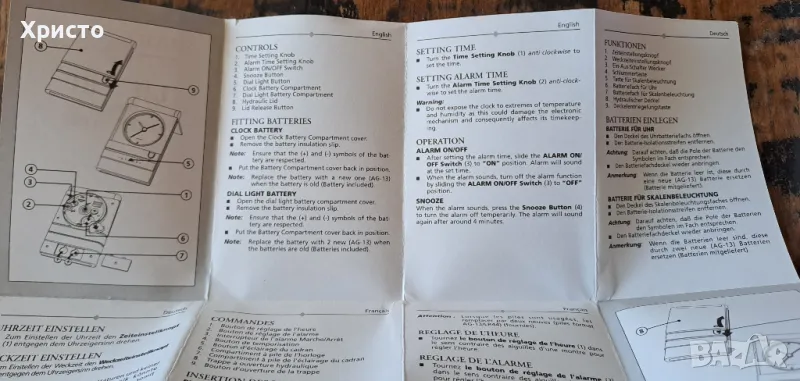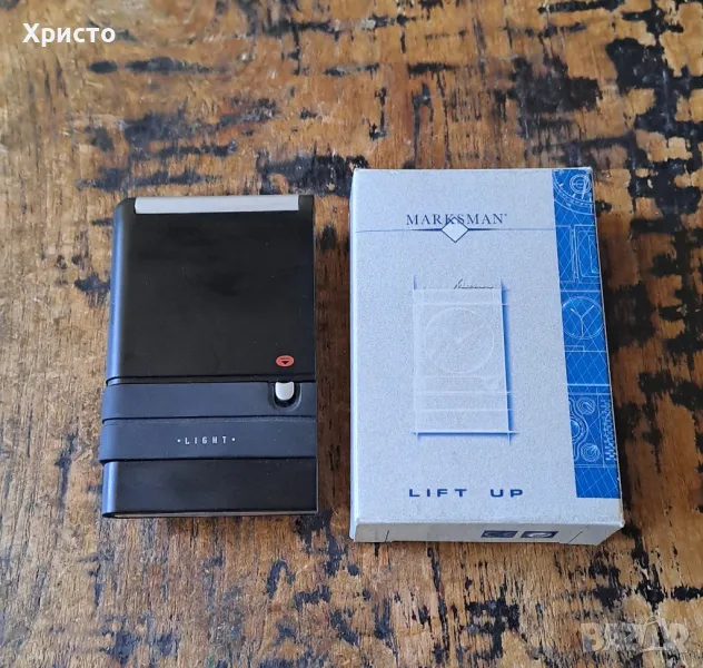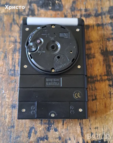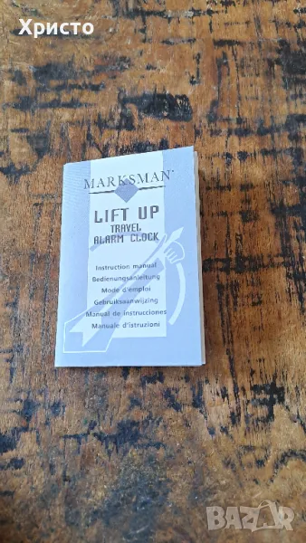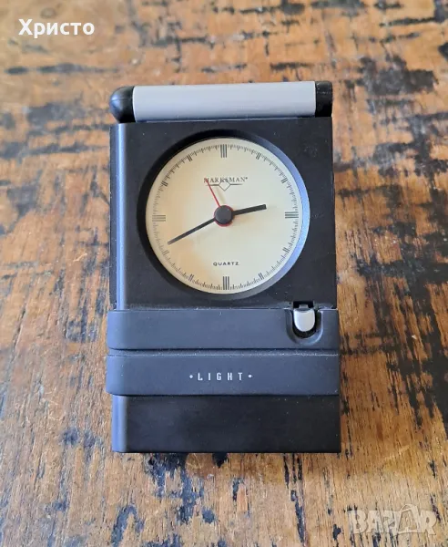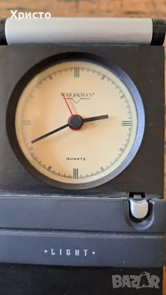часовник будилник за бюро Марксман, Travel Marksman с повдигащ се бавно капак и светлина за циферблата. Внос от Холандия. Има бутон за освобождаване на капака, който се отваря плавно. Има бутон "Light", който осветява циферблата при натискане. Инструкция за употреба и сертификат. Часовникът работи с 1 брой батерия AG13, която не е включена в цената, а светлината на циферблата работи с 2 броя батерии AG13 батерии, които не са включени в цената. Часовникът е с размери 7х11х2см. В оригинална кутия с размери 7.8х11.7х2.7см. Уникален, страхотен подарък. От частна колекция.