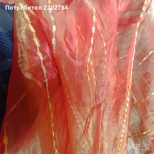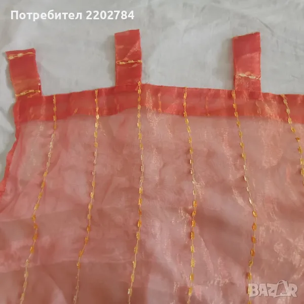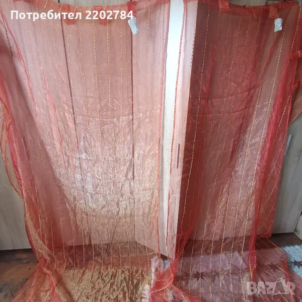 Третия комплект е от два броя пердета от прозрачна органза хамелеон сменяща цветовете от оранжево към златно и червено.С ,,уши" за нанизване на тръбен корниз.Размери на едното ширина 140см, дължина 240см.