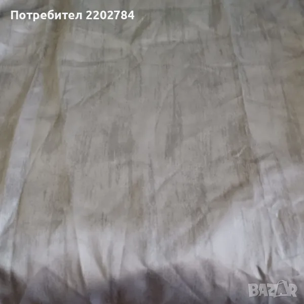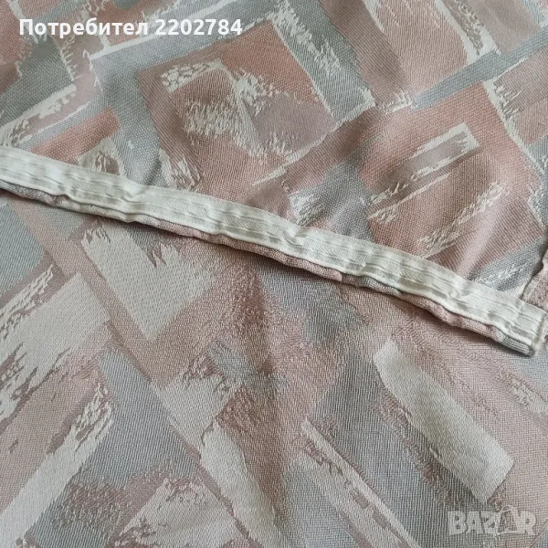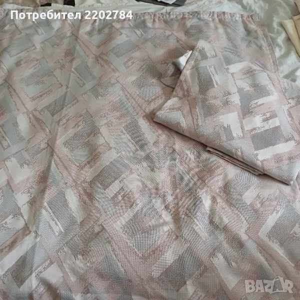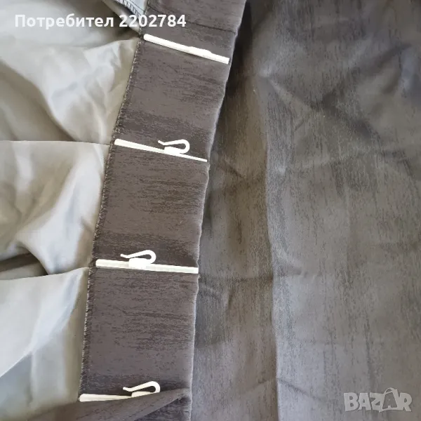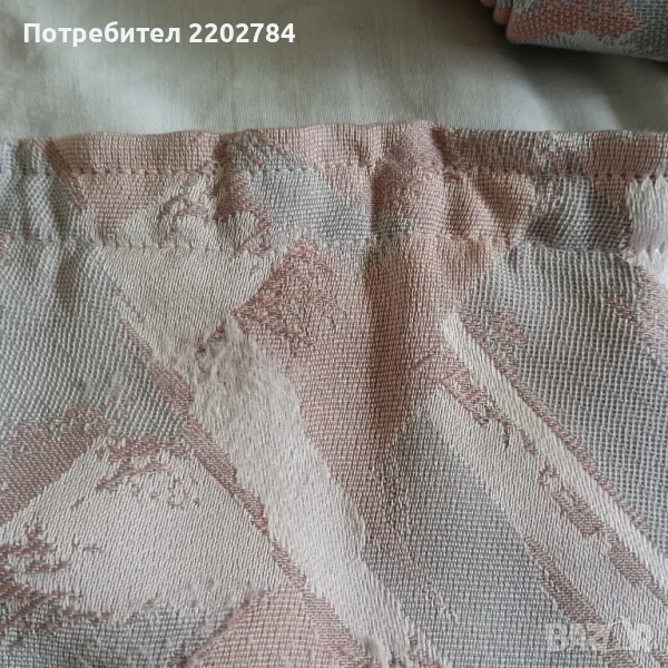 Последния комплект от две пердета е от плътен полиестер,не се мачка в пастелни цветове - пепел от рози и сиво.С перделик без копчета за корниз.Има миниатюрно завалване в горната част до перделика(на последната снимка)Размери на едното - ширина 130см, дължина 170см.