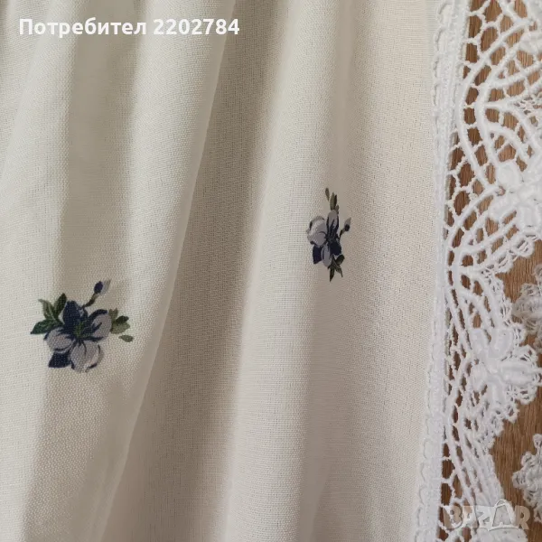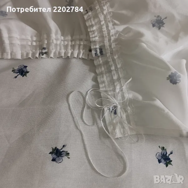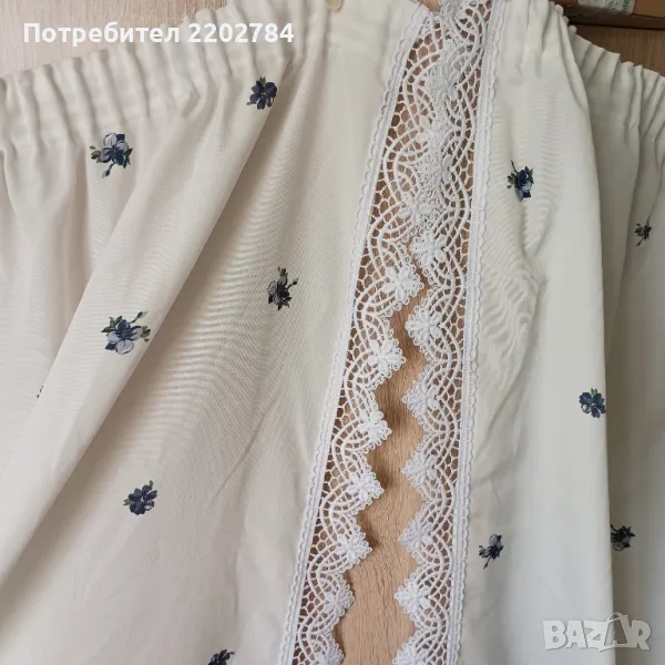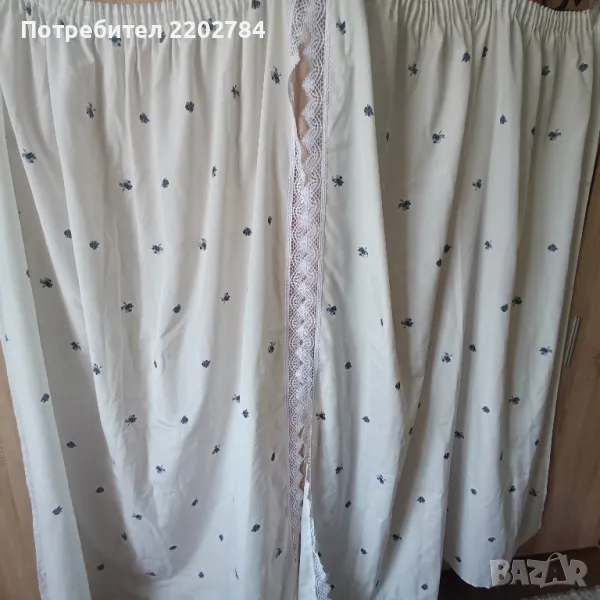 Четвъртия комплект е от две пердета от плътен бял полиестер с дребни сини цветчета,обточени с дантела от едната дължина.Почти не се мачкат.С перделик без копчета за корниз.Без забележки.Размери - ширина 140см, дължина 170см.
