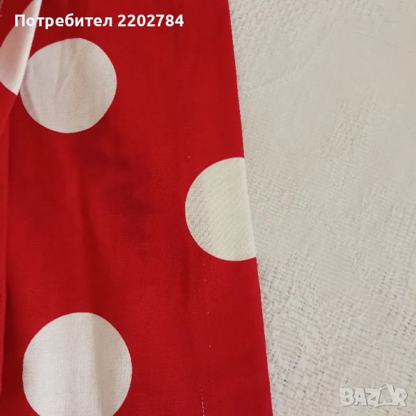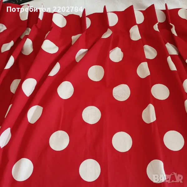 Втория комплект е в наситено червено с големи бели точки.Плътни и много усмихнати.С пластмасови кукички и фиксирана ширина в горната част.Размери на едното: ширина в горната част 100см, ширина в долната част 205см, дължина 190см.Едното има бледо петно в единия край - на последната снимка.