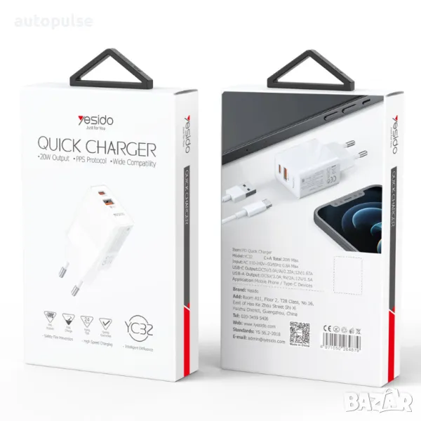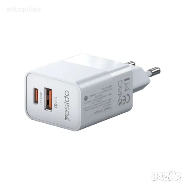 Зарядно устройство за контакт YESIDO 20W, 1xUSB-A, 1xUSB-C, 230V → Обява 46946976