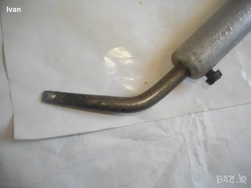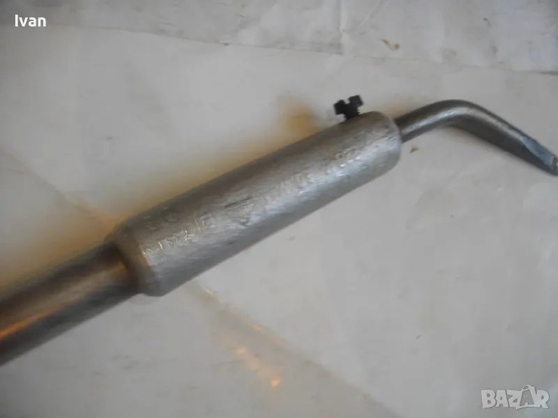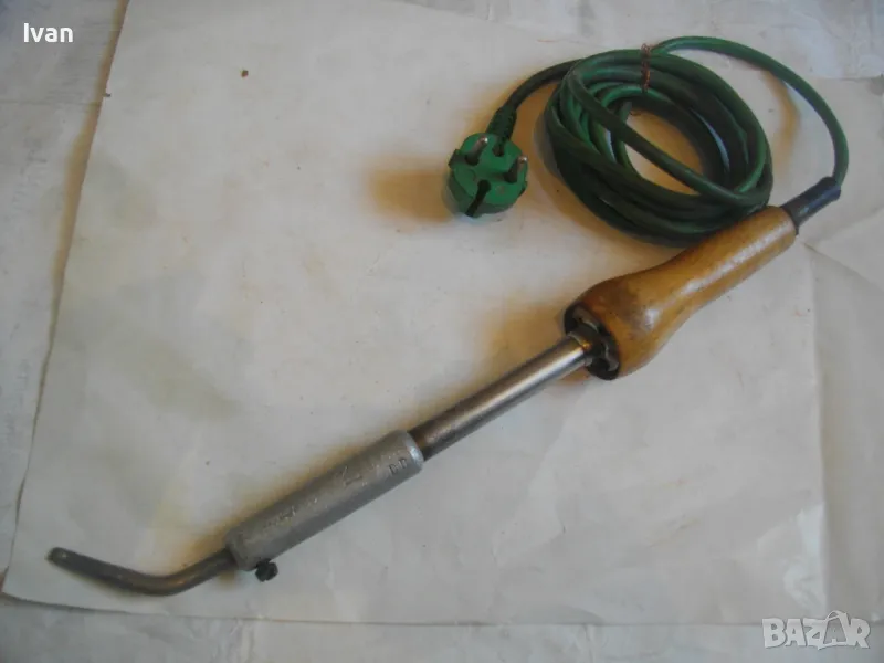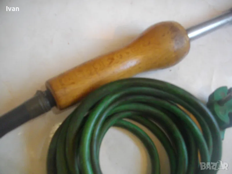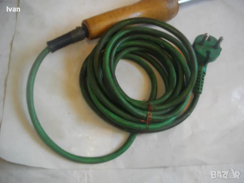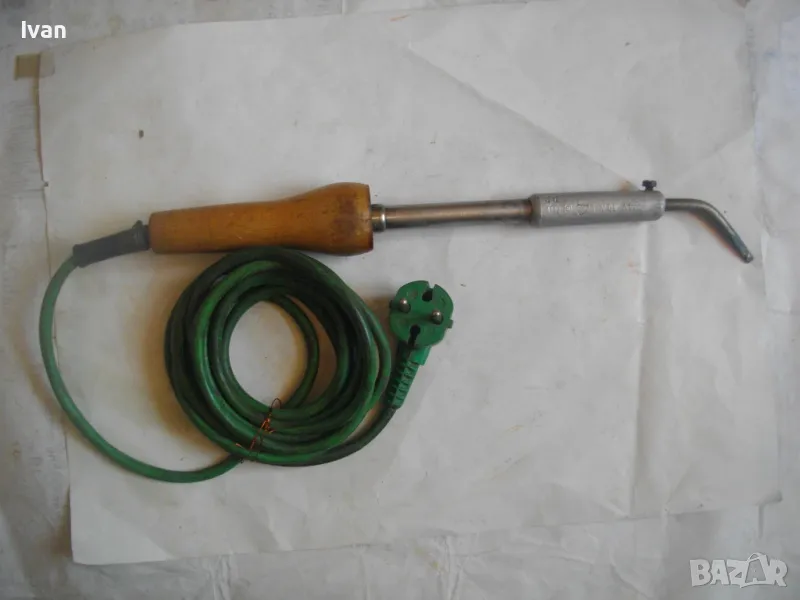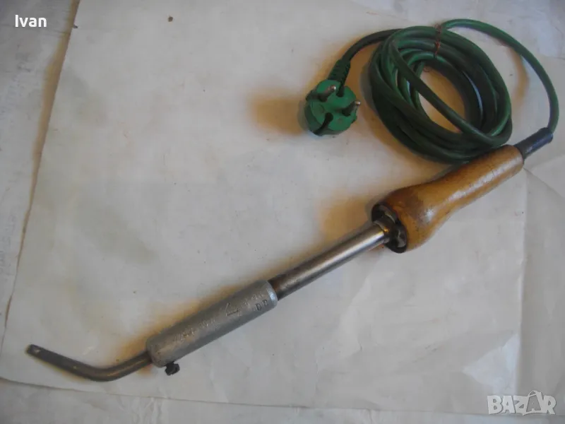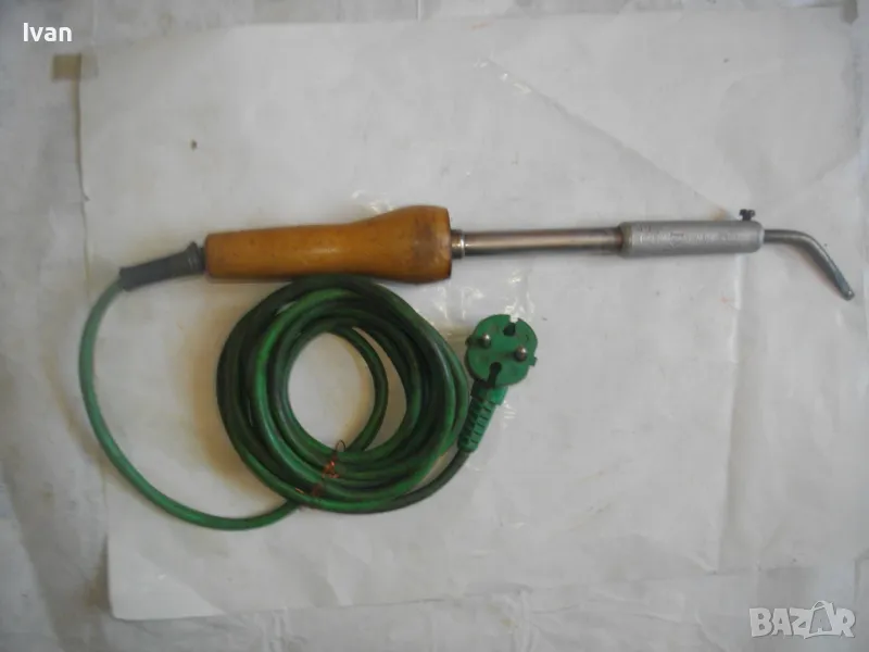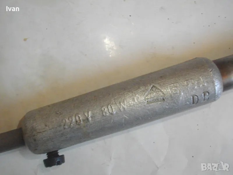 ОПИСАНИЕ на ел.поялник със зелен кабел- 99 лв. Немски. Старо качество. Запазен външен вид и отлично техническо/работно състояние. Почти нов. Производство Западна Германия преди 1989 г. Алуминиева глава над реотана. Мощнот на реотана - 80 вата. Цялостна дължина 36 см. Дървена масивна дръжка.Човка медна 7 см. Зелен оригинален захранващ кабел с еднокомпонентен с кабела щепсел. Маркировки по уреда: W.GERMANY - ZEVA Aposten DB лого на марката.