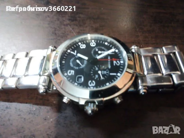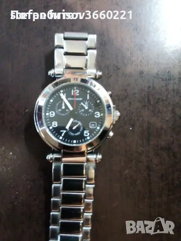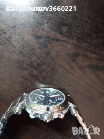 перфектно работи.много елегантен и оригинален часовник.дата, час, хронограф и ден от седмицата.съвсем леки следи от употреба.