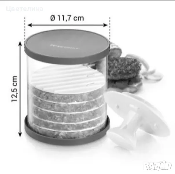 Приготвянето на домашни бургери става по-лесно и приятно, като осигурява перфектни резултати всеки път. С неговия интуитивен дизайн, висока функционалност и устойчиви материали, този уред е незаменим помощник в кухнята на всеки ентусиаст на бургерите. Предназначен за лесно и прецизно оформяне и изваждане на домашно приготвени бургери. Може да се използва и за съхранение за кратко време преди термична обработка. Със скала, която позволява да се оформят точно еднакви части от каймата, така че да се получат тънки (100gг) или по-дебели (150gг) бургери. Размери: 11.7xH12.5cm Изработен от устойчива пластмаса. Подходящ за почистване в съдомиялна машина. Гаранция: 3 години