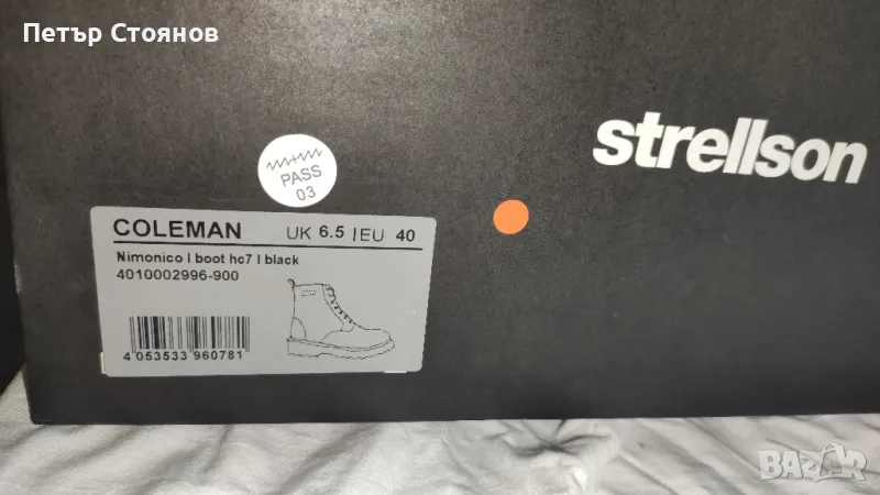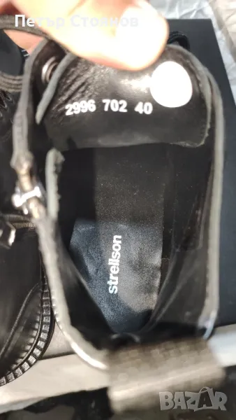 Предлагам удобни мъжки /юношески/ БОТИ НА РЕНОМИРАНАТА МАРКА STRELLSON. Обувките са чисто нови, в кутия, закупени са миналата година на цена от 59.95 евро. Изработени са в Индия от черна естествена кожа, хастарът и стелката също са от естествена кожа, подметката от полиуретан. Имат връзки отпред и цип от вътрешната страна на обувката. Дължината на стелката е 26 см, височината на тока е 4 см, височината на цялата обувка е 17.5 см. Изпращам с избран от купувача куриер и възможност за преглед и тест.