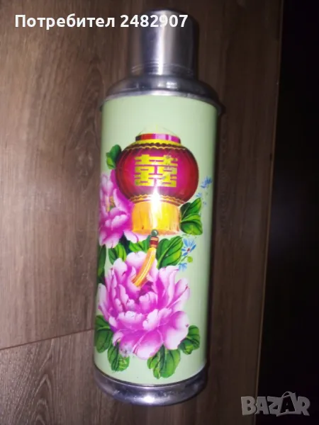 Много стар термос с красив дизайн в китайски стил. Височина - 39 см, диаметър в долната част - 12 см. Запазен.