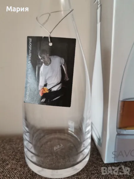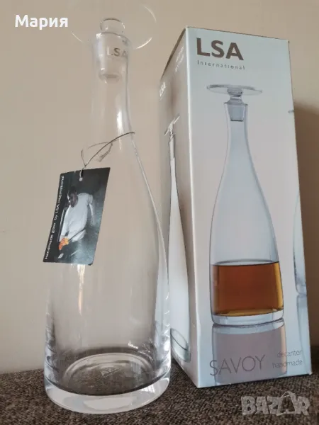 Декантер LSA от колекция "Savoy", вместимост 1 литър. Ръчна изработка, тип стъкло- издухано стъкло. Тапа под формата на диск. Маркировка LSA. Нов в кутия. Подходящ за подарък.