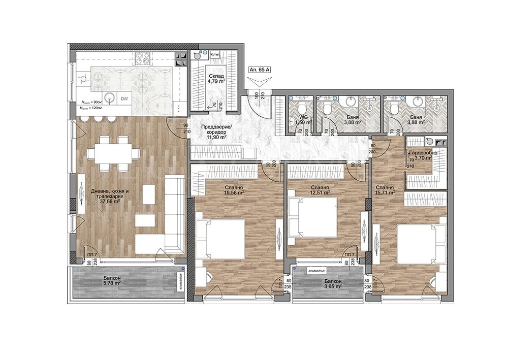 Апартаментът е четиристаен, с обща площ 168.36 кв.м. (нетна площ 144.75 кв.м. + общи части 23.61 кв.м.) и е разположен на четвърти етаж.