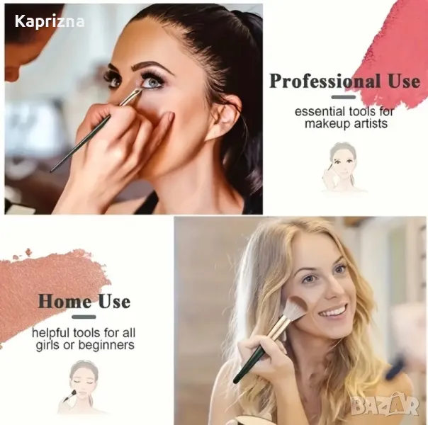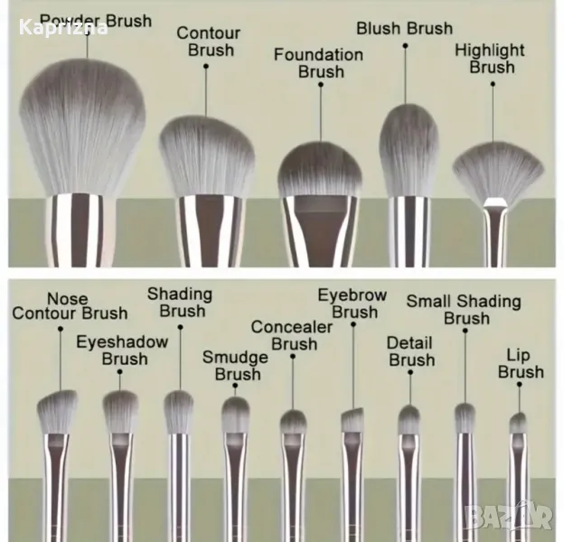 – 14четки за грим – четки за сенки, четки за течно червило, четки за руж, четки за фон дьо тен, четка за коректор за грим, четка за пудра, четка за сенки за очи, четка за фон дьо тен.