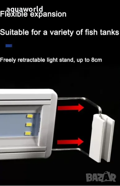Осветително лед тяло за аквариум. Модела е с регулируеми крачета от двете страни които се захващат за стъклото на аквариума. Възможно е поставяне както на ръбовете на аквариума, така и на капака.