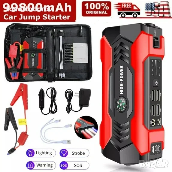 Jump starter представлява най -мощната li-po4 батерия капацитет 39000mAH Която е годна за подаване на ток на автомобил (или бус) с 12волта система, за стартиране директно без зареждане ( също като подаване от друг автомобил със щипки). При напълно заредена батерия можете да стартирате около 15- 20пъти автомобил. Втората функция е Power bank + фенер -