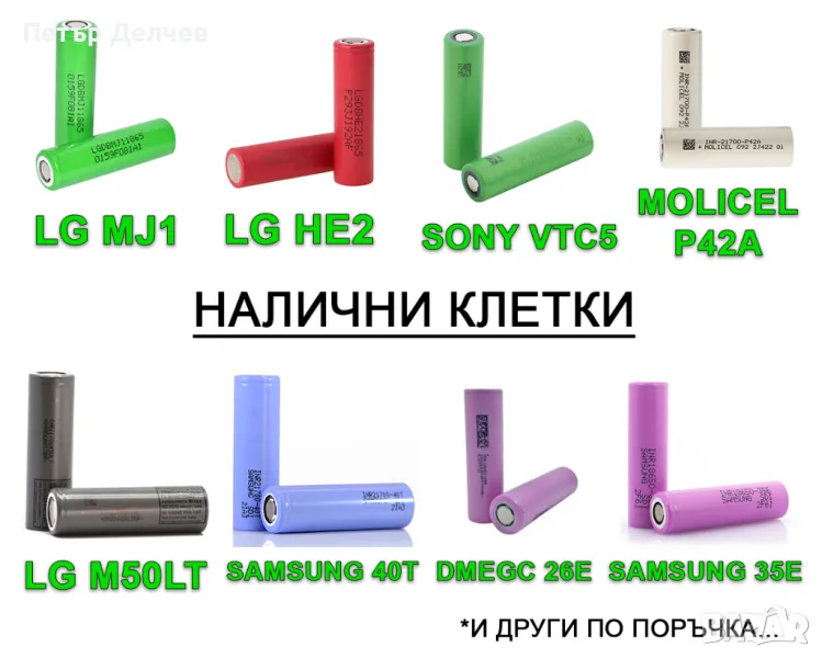 *Освен посочените цилиндрични клетки, работим по поръчка и с плоски (pouch / полимерни) предназначени за електромобили, както и с призматични (твърди правоъгълни) литиево-желязно-фосфатни (LiFePo4) за домашни соларни инсталации.