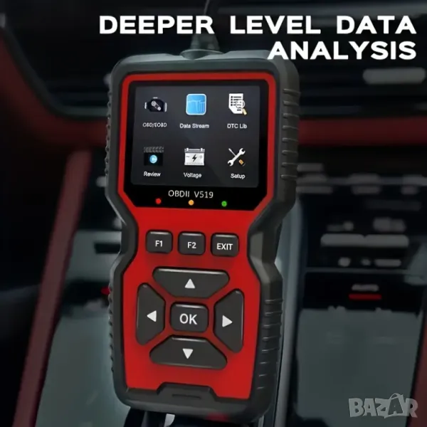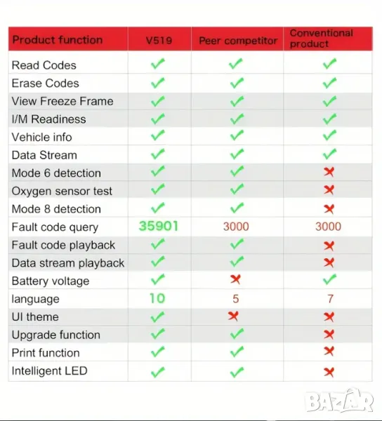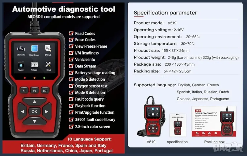- OBDII скенерът V519 предлага цялостна OBD2 функционалност. извличане на кодове за грешки за широка гама от автомобили, SUV, леки камиони и 12V дизелови превозни средства, оборудвани с OBD2.